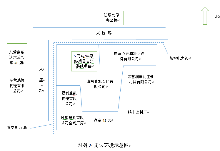 東側(cè):廠區(qū)圍墻東側(cè)自北向南依次為東營(yíng)心正和凈化設(shè)備有限公司(石油裝備生產(chǎn)企業(yè))、東營(yíng)利豐化工新材料有限公司與銀豐涂料廠,共用圍墻。西側(cè):廠區(qū)西側(cè)為興盛路,路對(duì)面為東營(yíng)富豪沃爾沃汽車4S店與東營(yíng)鴻德物流有限公司。南側(cè):廠區(qū)圍墻南側(cè)為墾利勝凱物流有限公司、勝奧建機(jī)有限公司空閑廠房、汽車4S店。北側(cè):廠區(qū)北側(cè)圍墻外為興園路,路北為一家防腐公司辦公樓。 |