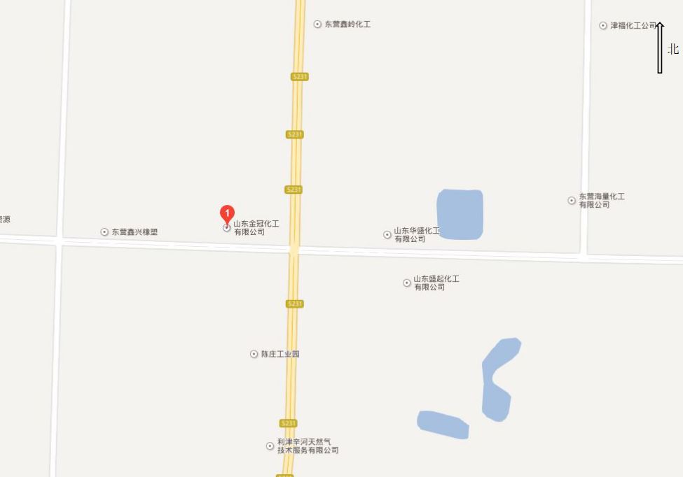 山東金冠化工有限公司位于東營市利津縣陳莊工業(yè)園。路東為S231,S231東側(cè)為華盛化工有限公司;廠區(qū)南側(cè)為北一路;西側(cè)為鑫興橡膠有限公司;東北側(cè)120米處,布置有機械采油井;北側(cè)為空地,空地以北為黃河口酒業(yè)有限公司。 |