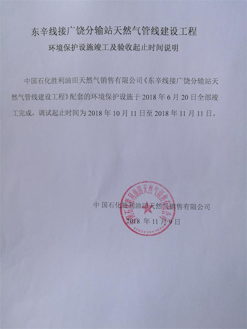 東辛線接廣饒分輸站天然氣管線建設(shè)工程環(huán)境保護設(shè)施竣工及驗收起止時間說明