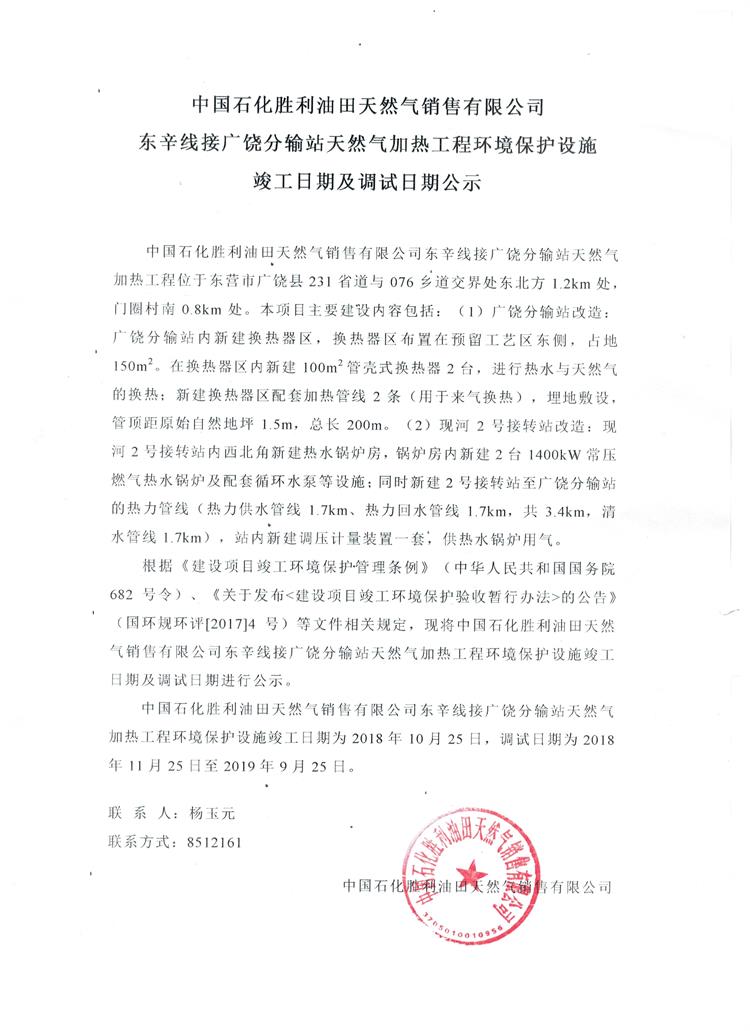 中國石化勝利油田天然氣銷售有限公司東辛線接廣饒分輸站天然氣加熱工程環(huán)境保護設施竣工日期及調試日期公示
