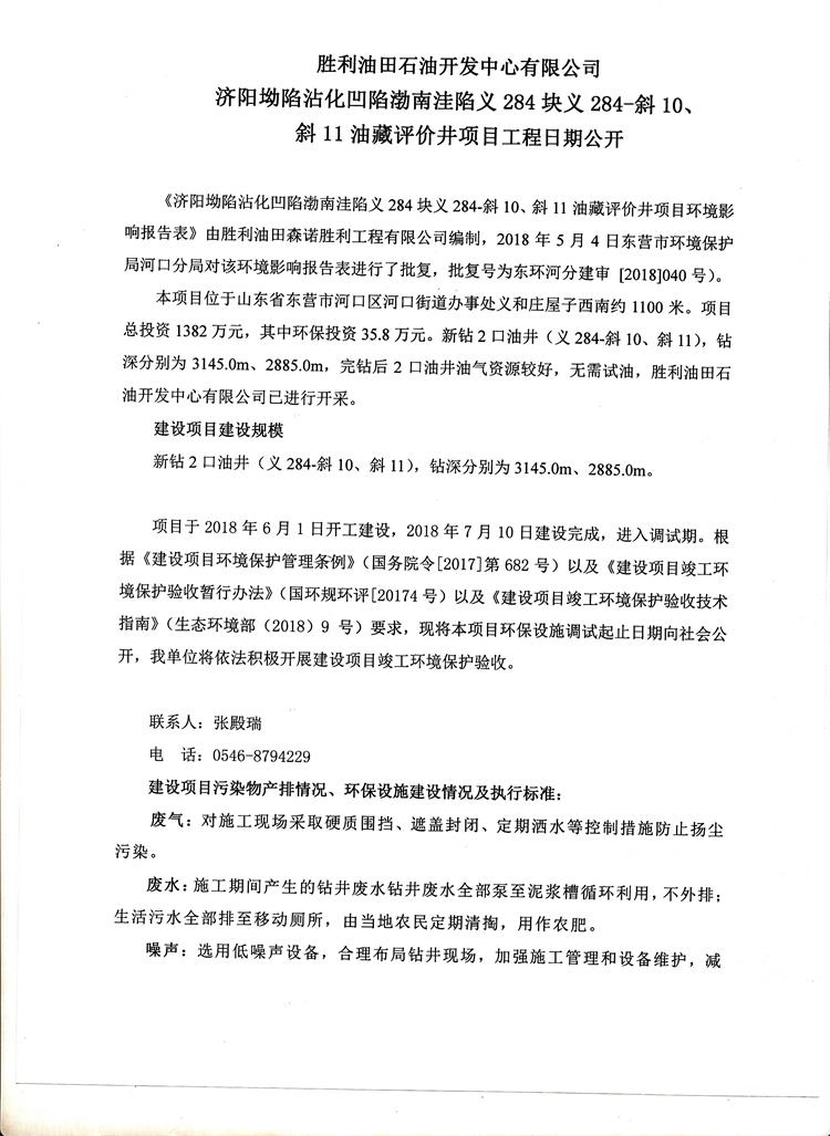 勝利油田石油開發(fā)中心有限公司濟(jì)陽(yáng)坳陷沾化凹陷渤南洼陷義284塊義284-斜10、斜11油藏評(píng)價(jià)井項(xiàng)目工程日期公開