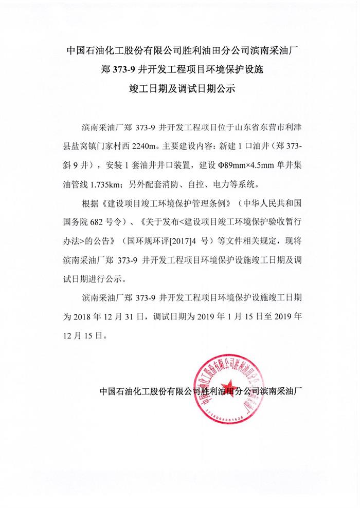 中國石油化工股份有限公司勝利油田分公司濱南采油廠鄭373-9井開發(fā)工程項目環(huán)境保護設(shè)施竣工日期及調(diào)試日期公示