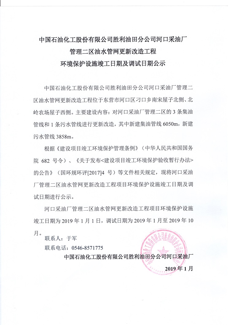 中國(guó)石油化工股份有限公司勝利油田分公司河口采油廠管理二區(qū)油水管網(wǎng)更新改造工程環(huán)境保護(hù)設(shè)施竣工日期及調(diào)試日期公示