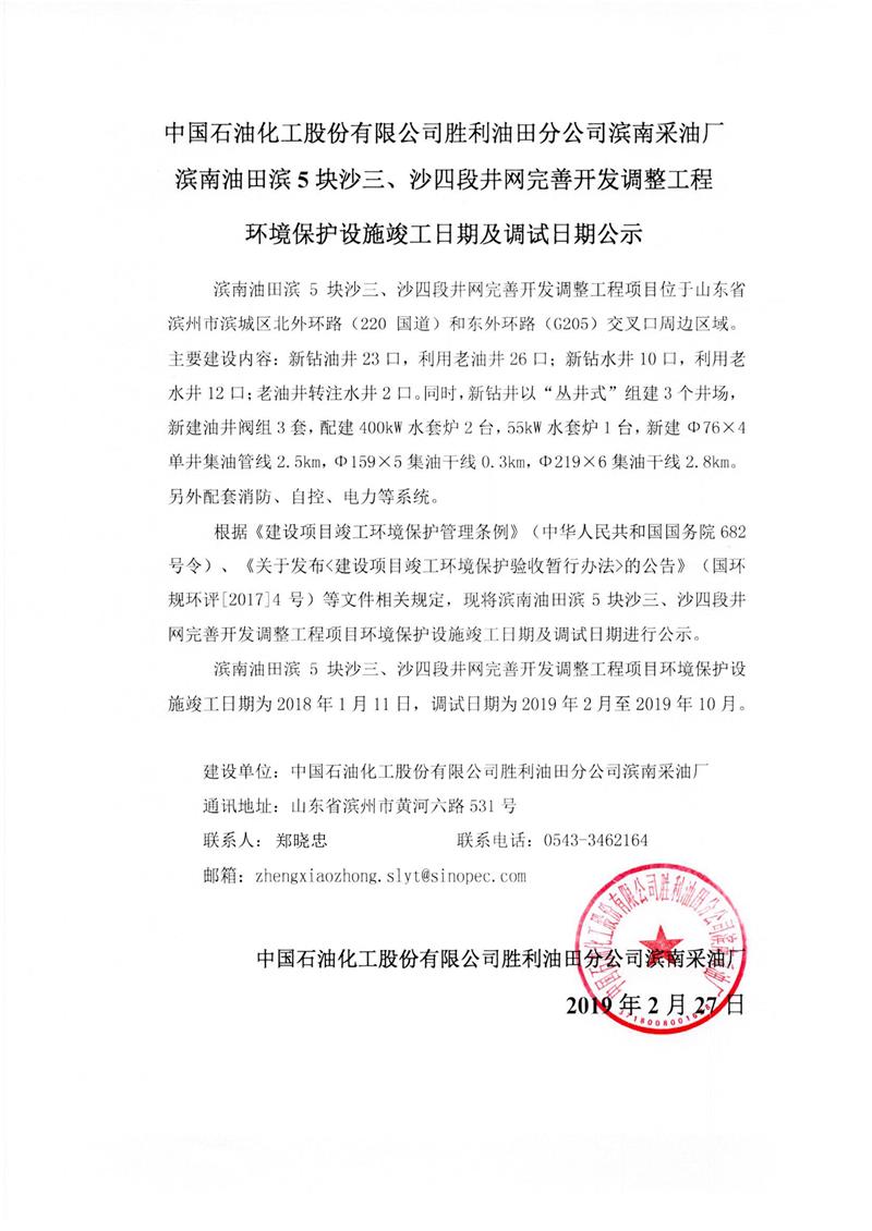 中國石油化工股份有限公司勝利油田分公司濱南采油廠濱5塊沙三、四段井網(wǎng)完善開發(fā)調(diào)整工程環(huán)境保護設(shè)施竣工日期及調(diào)試日期公示
