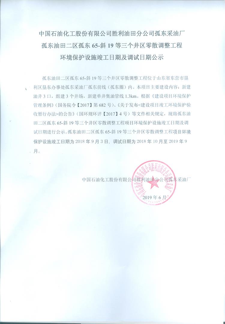 中國(guó)石油化工股份有限公司勝利油田分公司孤東采油廠孤東油田二區(qū)孤東65-斜19等三個(gè)井區(qū)零散調(diào)整工程環(huán)境保護(hù)設(shè)施竣工日期及調(diào)試日期公示