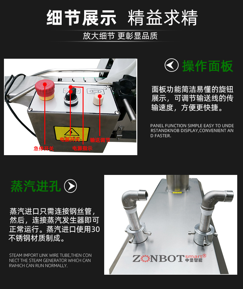 - 進(jìn)出口護(hù)罩:設(shè)備前后端裝有進(jìn)出口護(hù)罩裝置,能夠減少蒸汽外泄,既保持工作環(huán)境的整潔,又能節(jié)約能源,同時(shí)還起到一定的安全防護(hù)作用,降低操作人員接觸高溫蒸汽的可能性。