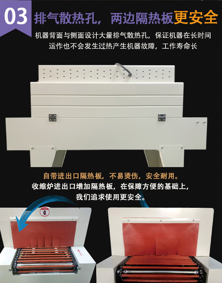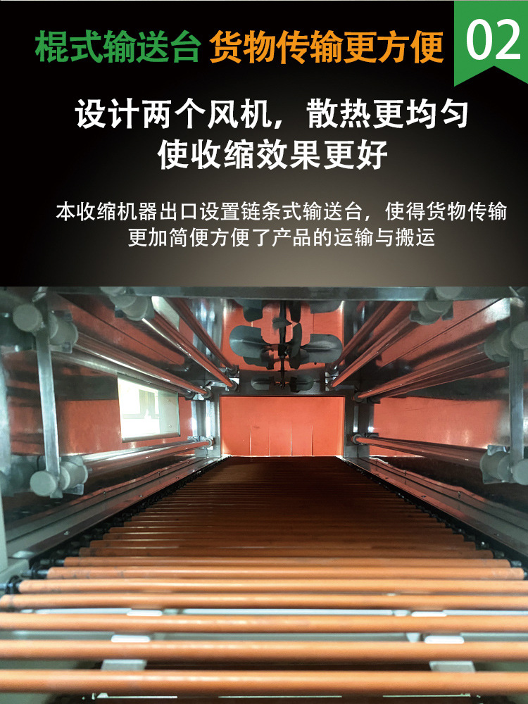 - 石英管加熱型:石英管加熱具有升溫快、熱效率高的特點。石英管能夠快速將熱量輻射到加熱隧道內,使薄膜快速收縮。這種類型的機器適合中小規模的包裝作業,如小型工廠、商鋪對產品的包裝。
