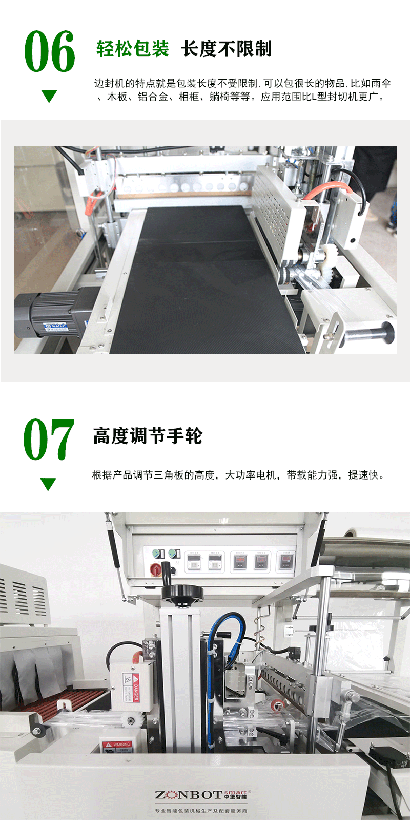 - 負責將待包裝物品平穩地輸送通過各個工作區域,包括薄膜套膜區、封切區等。輸送帶的速度通常是可調節的,以便適應不同的生產節奏和包裝速度要求。其表面一般較為光滑,以減少對物品和薄膜的摩擦,確保輸送過程的順暢。