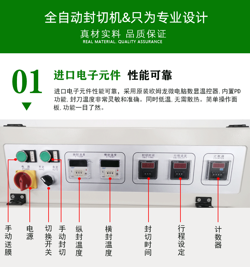 - 負責對整個全自動封切機的運行進行全面控制,包括啟動、停止、調節輸送帶速度、設定封切溫度、控制薄膜張力等操作。操作人員可以通過控制面板方便地對各項參數進行設置和調整,同時,一些先進的控制系統還具備故障診斷和報警功能,當設備出現異常情況時,能及時提醒操作人員進行處理,保障設備的正常運行。