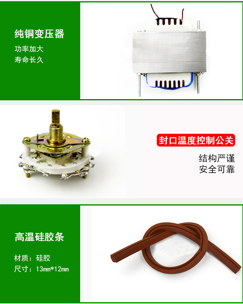 • 如前面所說,加熱條是由高電阻的合金材料制成的,常見的有鎳鉻合金等。它的長度和寬度會根據不同型號的腳踏封口機而有所不同,一般是要能夠覆蓋住常見包裝袋的封口寬度范圍。加熱條的兩端通過導線與封口機的電路相連接,當電路接通時,它就能快速升溫產生熱量啦。而且為了保證加熱的均勻性,加熱條在制作工藝上也會有一些講究,比如采用均勻繞制等方式。
