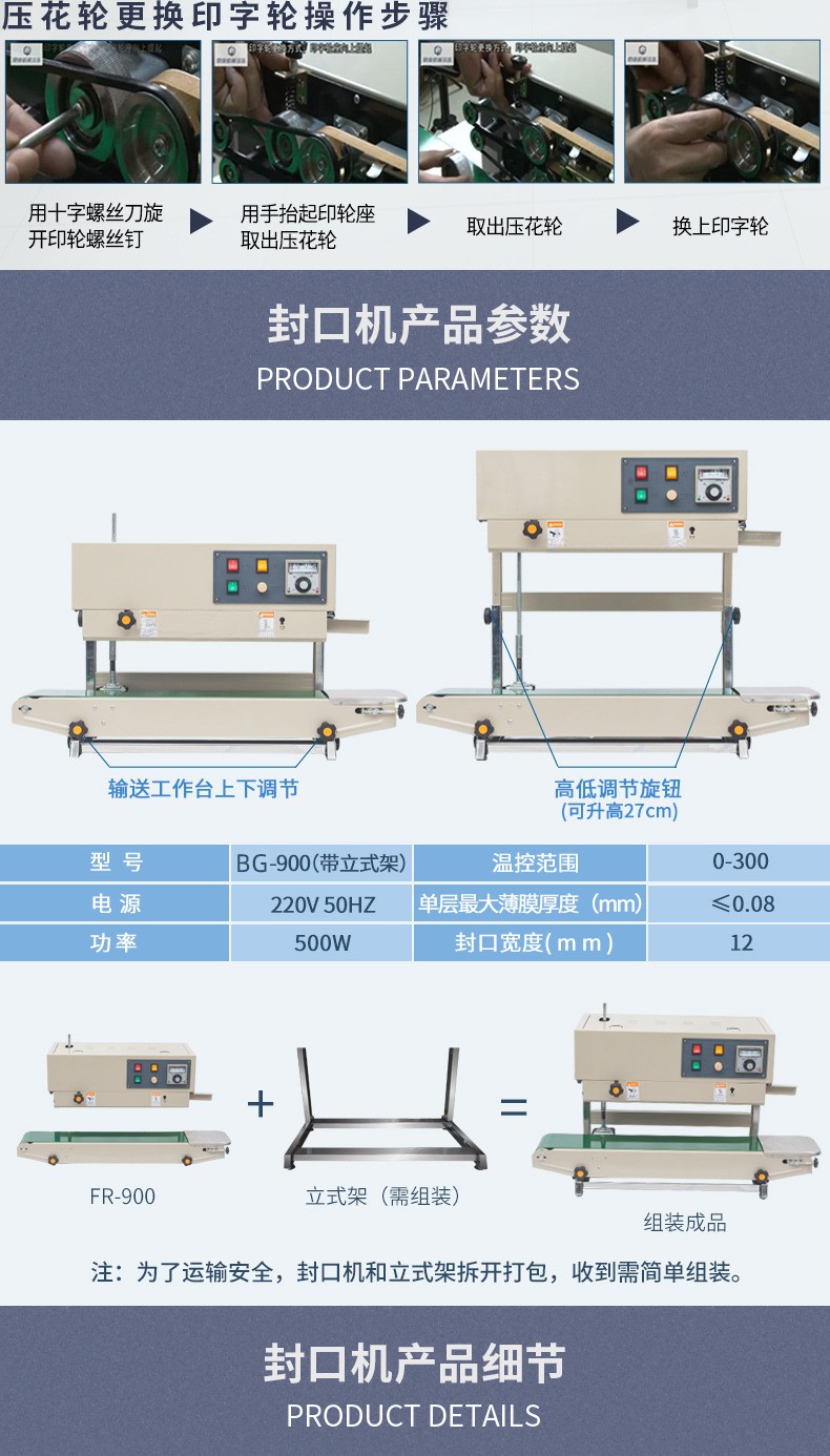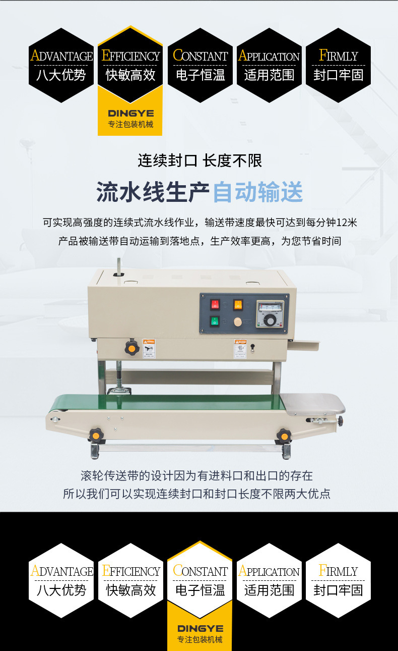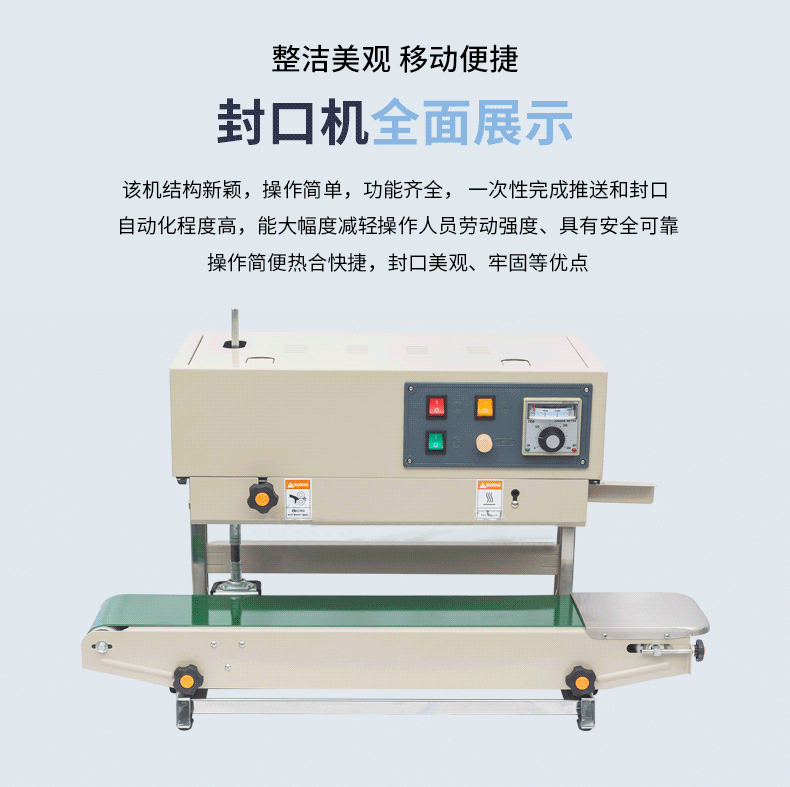 立式連續(xù)式封口機主要是通過輸送帶將包裝物品連續(xù)地輸送到封口區(qū)域