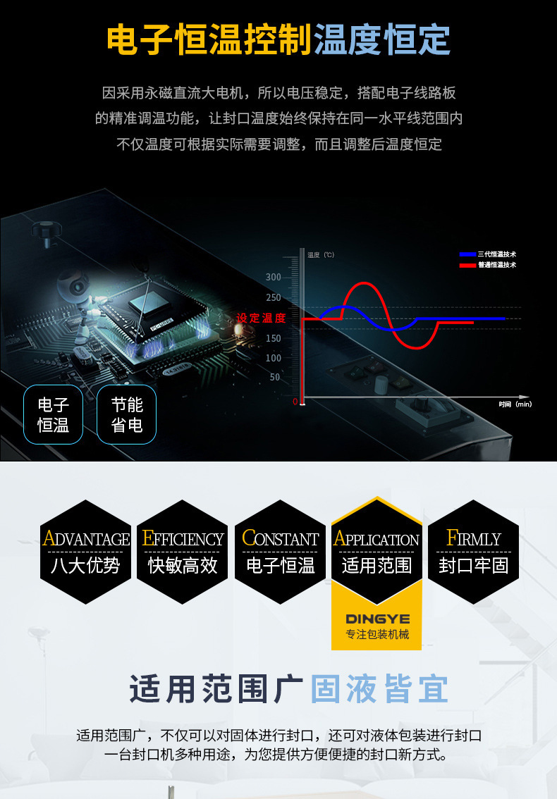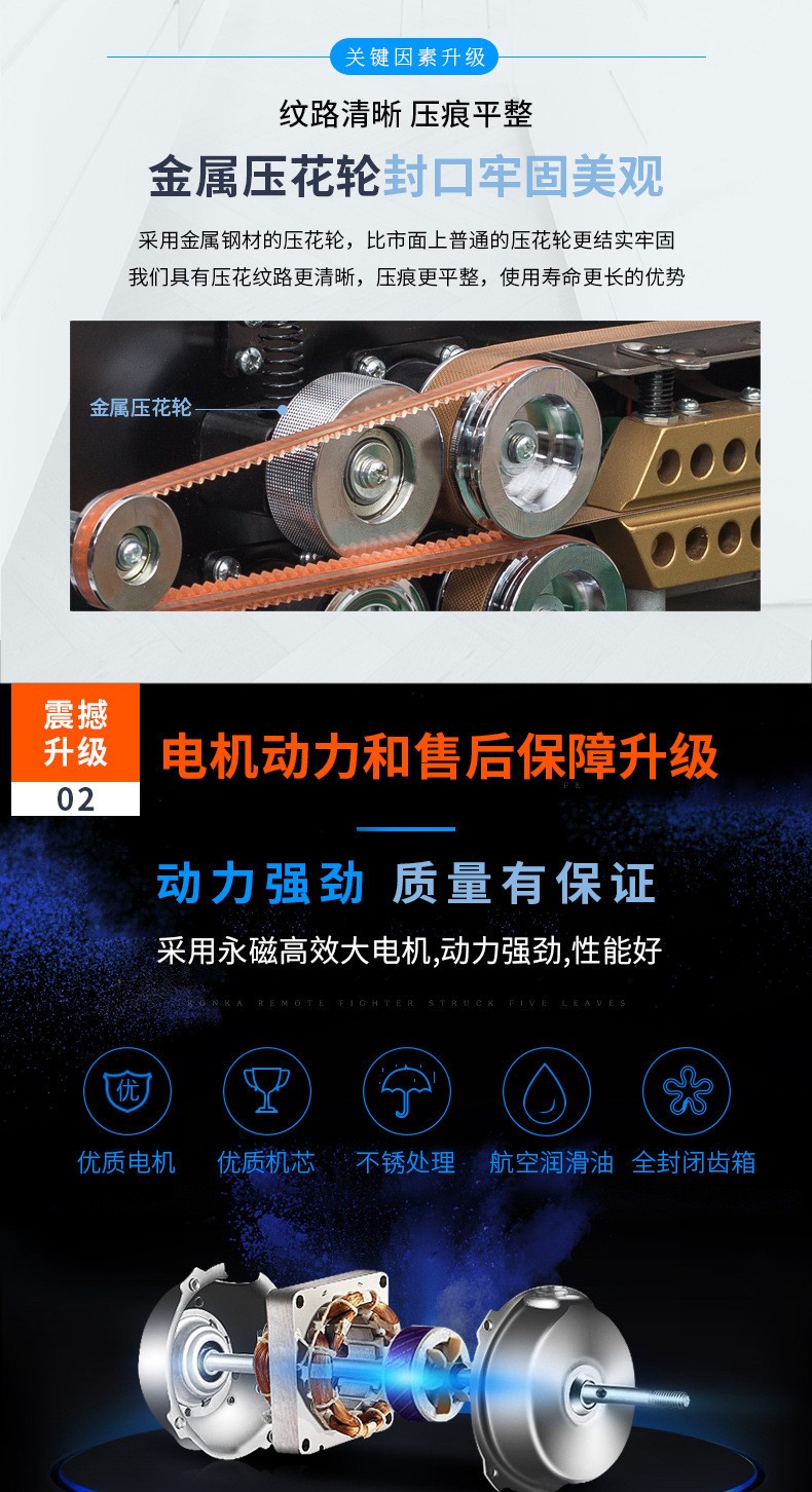 • 封口質(zhì)量穩(wěn)定:采用精確的溫度控制和穩(wěn)定的壓力裝置,能夠保證封口質(zhì)量的穩(wěn)定性。加熱系統(tǒng)可以根據(jù)包裝材料的特性精確調(diào)節(jié)溫度,使封口處的材料能夠均勻熔化并融合,壓力裝置確保上下包裝材料緊密貼合,形成牢固、平整的封口,有效防止包裝內(nèi)容物泄漏、受潮、氧化等問題1.