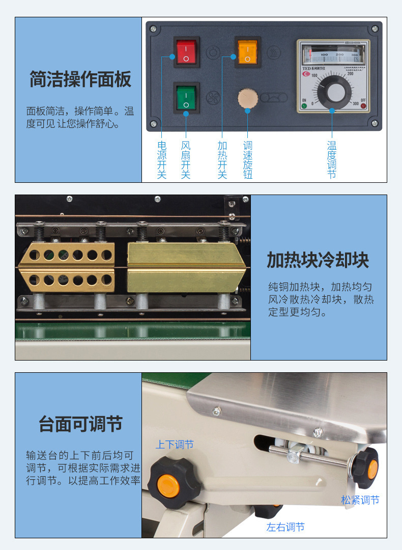 • 高效連續(xù)工作:能夠不間斷地對包裝進行封口,大大提高了生產(chǎn)效率,減少了設備頻繁啟動和停止帶來的能源損耗和機械磨損,延長了設備的使用壽命,降低了生產(chǎn)成本。其封口速度可以根據(jù)輸送帶的速度進行調(diào)節(jié),一般每分鐘可以封口 10-50 個包裝,具體速度取決于包裝的大小和復雜程度1.