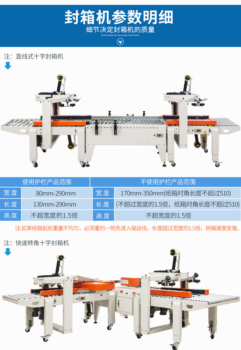 • 紙箱尺寸范圍:要明確自己日常需要包裝的紙箱尺寸范圍。在購買前,需要測量最小和最大紙箱的長、寬、高,然后選擇能夠覆蓋這個尺寸范圍的十字封箱機。有些封箱機可以通過調整部分裝置來適應不同尺寸的紙箱,但也有一定的限度。
