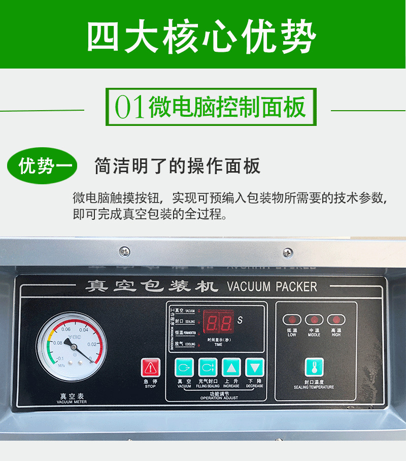 - 通過控制面板可以精確地設(shè)置真空度,能夠滿足不同產(chǎn)品對真空環(huán)境的要求。例如,對于一些對氧氣特別敏感的藥品,能夠?qū)b袋內(nèi)的真空度設(shè)置到較低水平,有效延長藥品的保質(zhì)期。