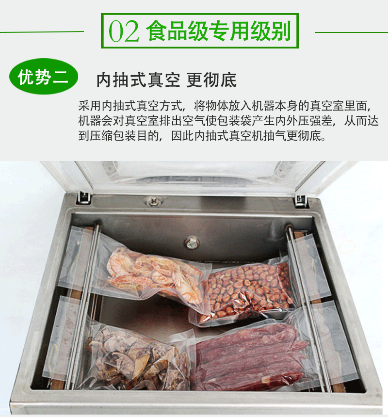 - 憑借精確的封口裝置,單室內(nèi)抽真空包裝機可以制作出密封牢固、外觀整齊的封口。封口強度高,能夠承受一定的壓力和摩擦,在產(chǎn)品運輸和儲存過程中不會輕易漏氣。