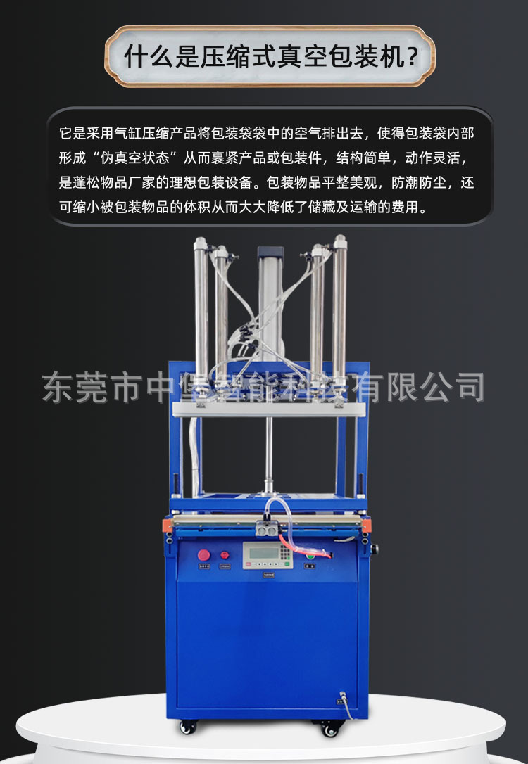 主要用于各種枕頭、羽絨被服、太空棉被、靠墊等蓬松物品的壓縮包裝及塑料袋的封口工序,可極大地壓縮包裝物體的體積,減少包裝物品的儲存空間12。此外也適用于食品、電子產(chǎn)品、醫(yī)藥、化妝品等行業(yè)中需要壓縮包裝的產(chǎn)品 5