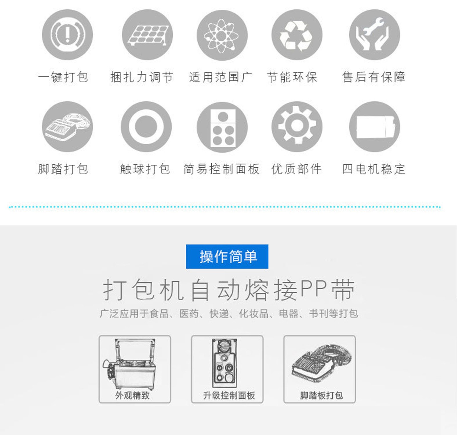 • 節(jié)省人力:整個(gè)捆扎過(guò)程無(wú)需人工全程參與,操作人員只需放置好物品,后續(xù)捆扎、拉緊、封合、切斷均自動(dòng)執(zhí)行,降低人工成本。