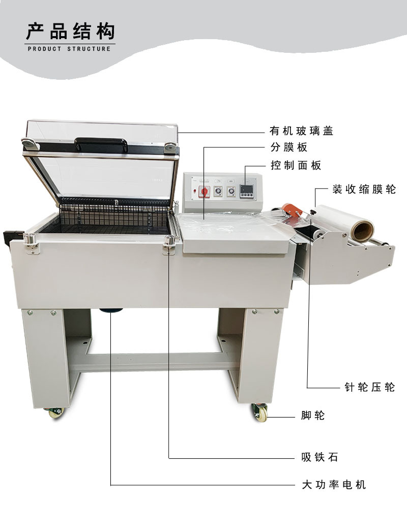 - 操作與維護方便:滑動式膠膜支架便于放置不同規格收縮膜;透明玻璃膠罩可觀察包裝過程;底部帶鎖腳輪,便于移動定位;可長時間連續操作,耗電量小。