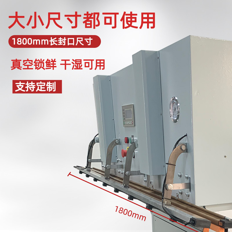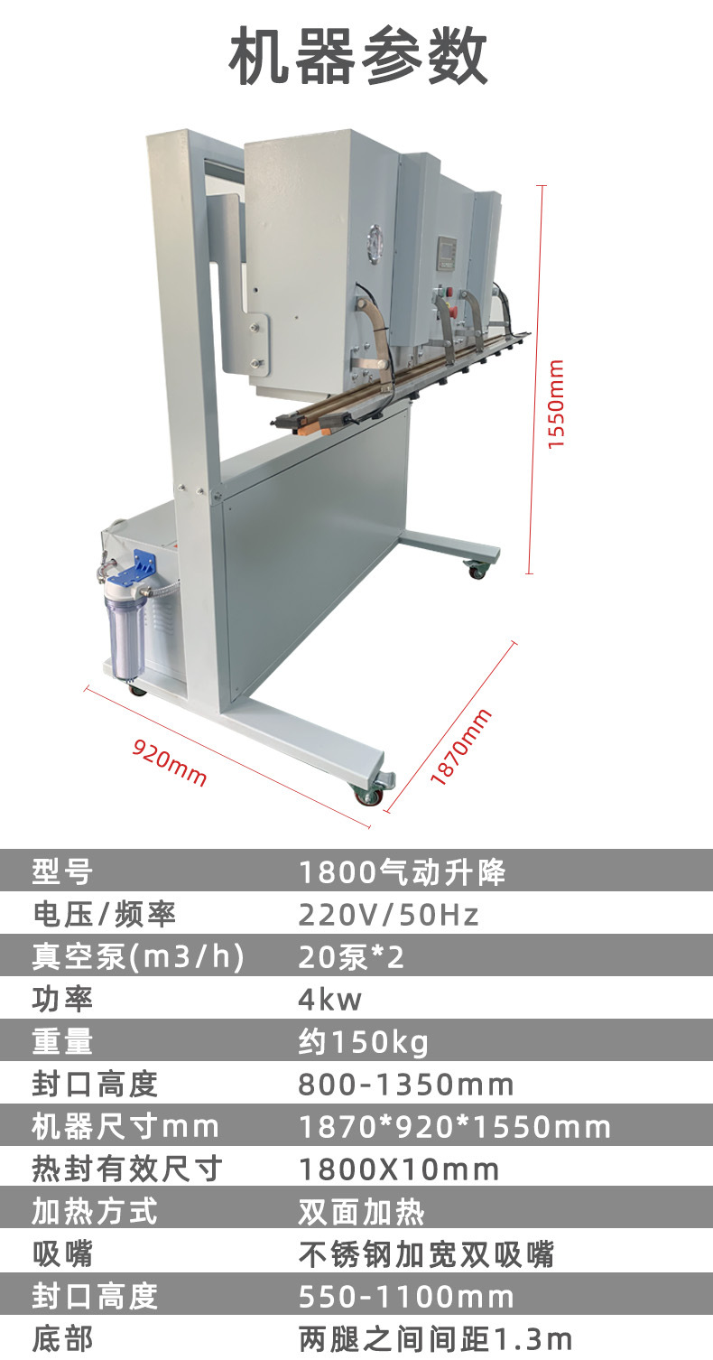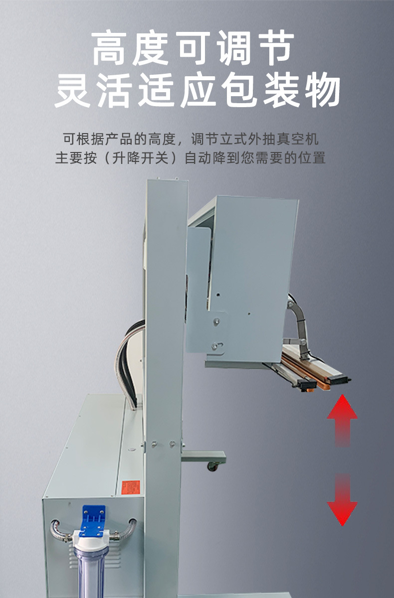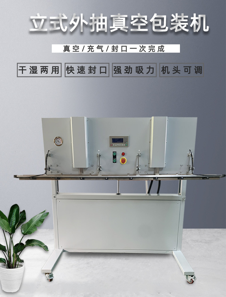 立式升降真空包裝機設計使得機器可以連同產品外包裝一起直接擱置于真空室內,完成內袋的真空封口,便于重物擱置