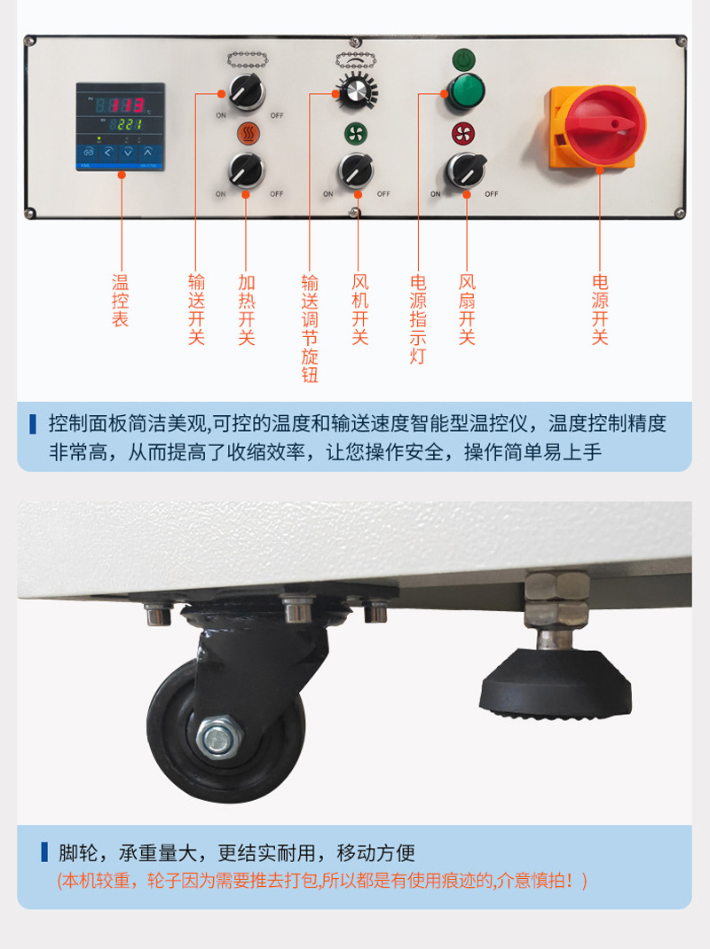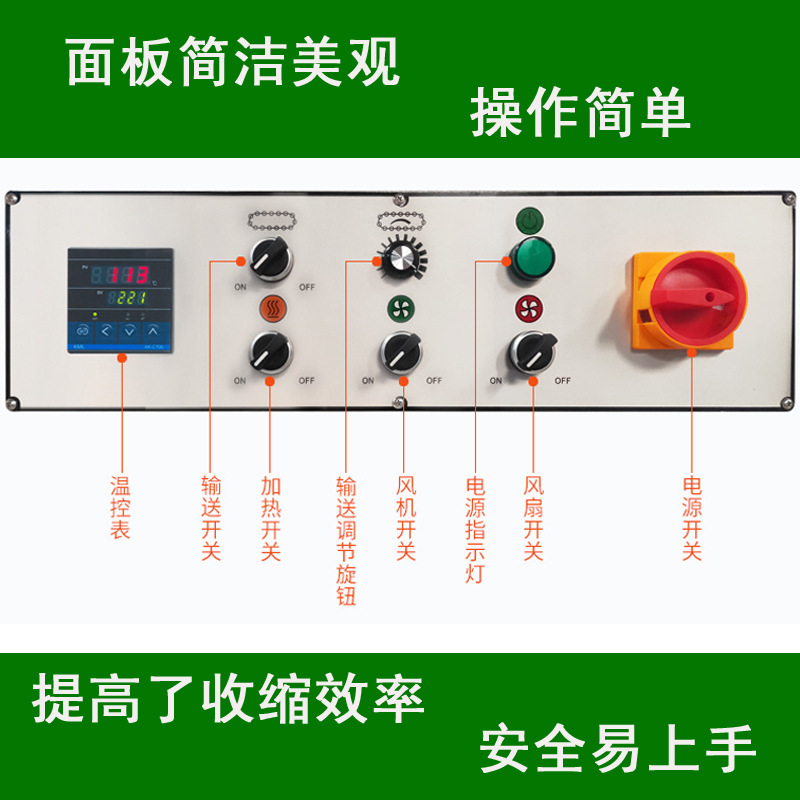 熱收縮通道:是產(chǎn)品進行熱收縮的區(qū)域,內(nèi)部設置有加熱元件和循環(huán)風機,使熱空氣在通道內(nèi)均勻流動,確保 PE 膜受熱均勻,收縮效果一致 。