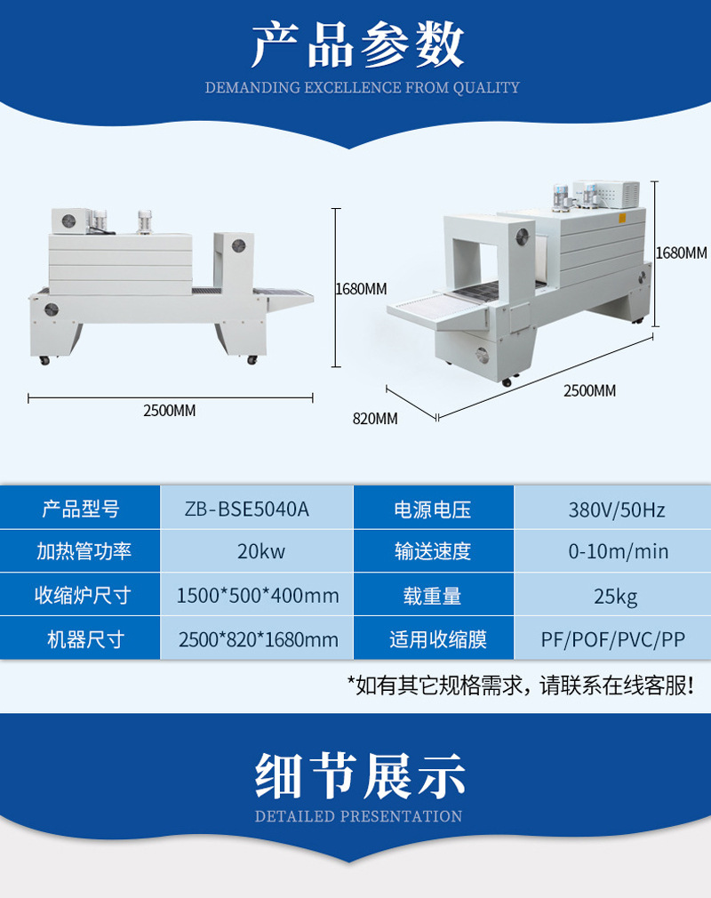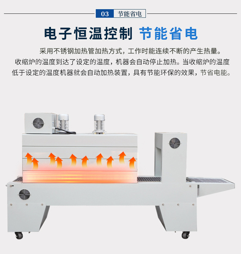 通過加熱裝置對套在產(chǎn)品外的 PE 膜進行加熱,使 PE 膜受熱收縮,從而緊緊貼合在產(chǎn)品表面,達到密封、防潮、保護產(chǎn)品及提升美觀度的效果 。