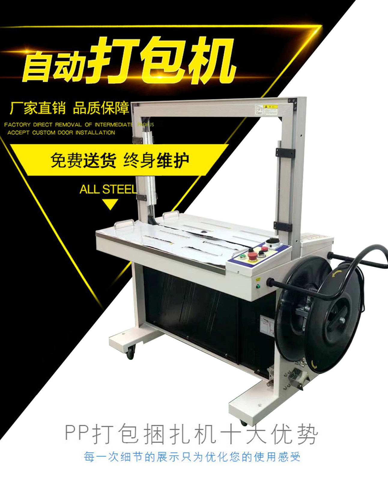 • 鋼帶自動(dòng)打包機(jī):采用鋼帶做打包材料,強(qiáng)度極高,能承受較大拉力,常用于重型機(jī)械、鋼材、大型設(shè)備等超重物的捆扎,缺點(diǎn)是鋼帶成本高,且操作有一定危險(xiǎn)性。