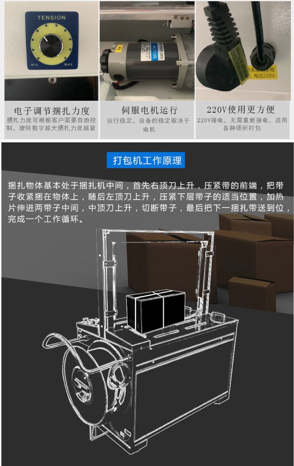 • 自動(dòng)打包機(jī)主要依靠機(jī)械傳動(dòng)與控制系統(tǒng)協(xié)同作業(yè)。將物品放置在指定位置后,通過傳感器感知,啟動(dòng)電機(jī)運(yùn)轉(zhuǎn),帶動(dòng)送帶、拉緊、切帶等一系列動(dòng)作。送帶輪把打包帶從帶盤輸送至待打包物體周圍,隨后拉緊裝置發(fā)力,讓打包帶緊緊束縛物品,最后切帶裝置精準(zhǔn)切斷打包帶,一個(gè)打包流程就此完成 ,部分高端機(jī)型還具備自動(dòng)貼標(biāo)功能。