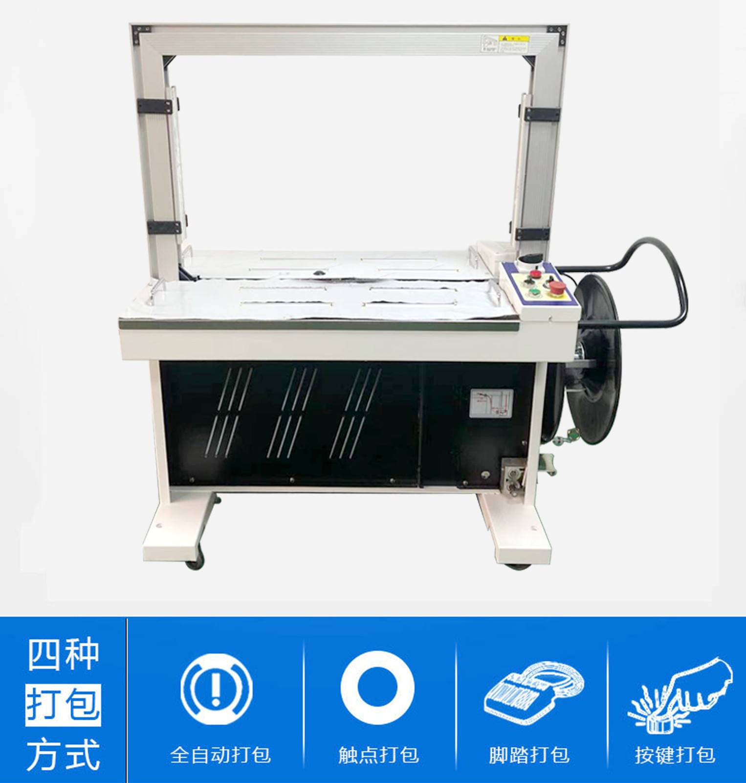 • 高臺(tái)自動(dòng)打包機(jī):機(jī)身較高,一般搭配輸送帶使用,貨物放置在輸送帶上,能自動(dòng)完成打包流程,適用于較重、體積較大的貨物連續(xù)打包,效率較高。