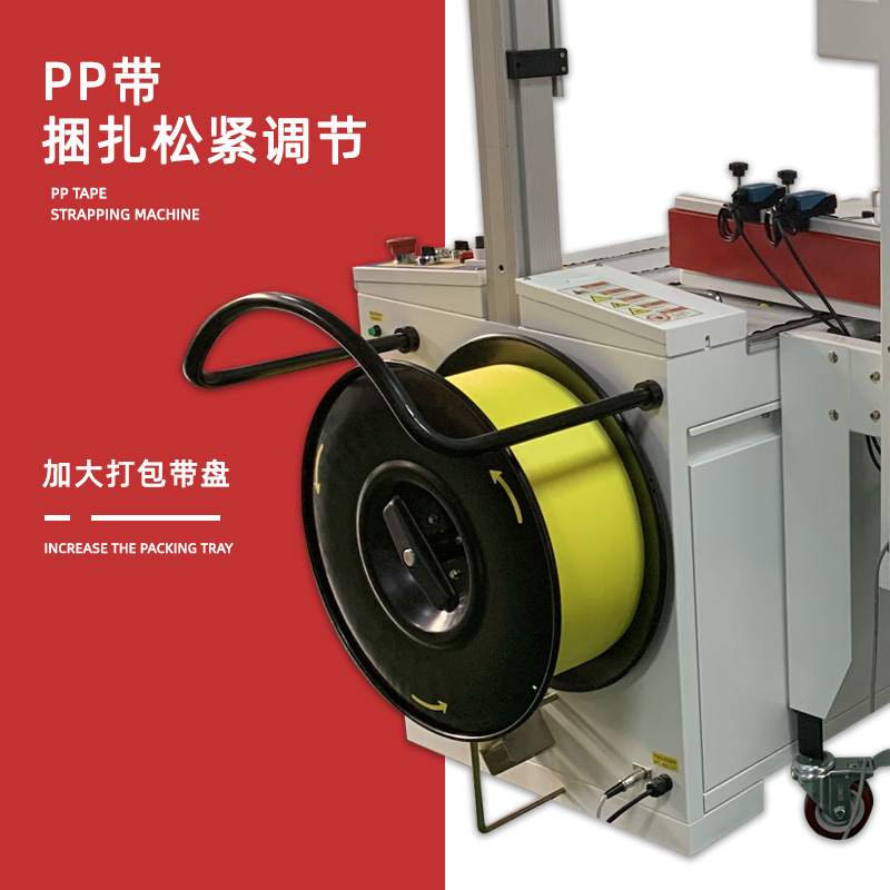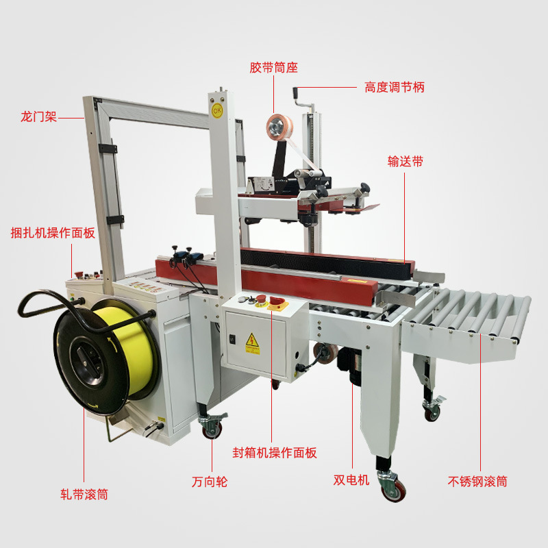 封箱打包一體機可自動調(diào)整打包帶長度和緊度,將多個產(chǎn)品打包成整體,便于運輸存儲