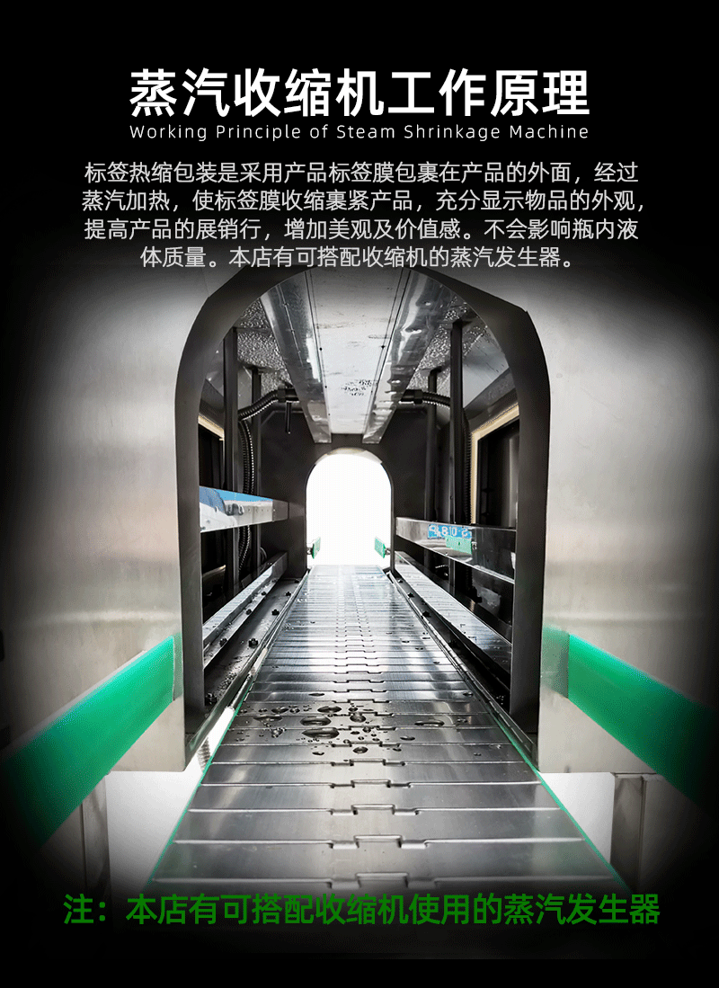 3. 熱傳遞引發收縮:當高溫蒸汽接觸到塑料薄膜時,熱量迅速通過熱傳導的方式傳遞給薄膜。塑料薄膜(常見如 PE、PVC 材質)具有熱塑性,吸收熱量后,分子鏈開始活躍起來,間距增大,薄膜隨之軟化。緊接著,隨著熱量的持續輸入,軟化的薄膜在產品外部開始均勻收縮,緊密貼合產品的輪廓,最終達到穩固、美觀的包裝效果。