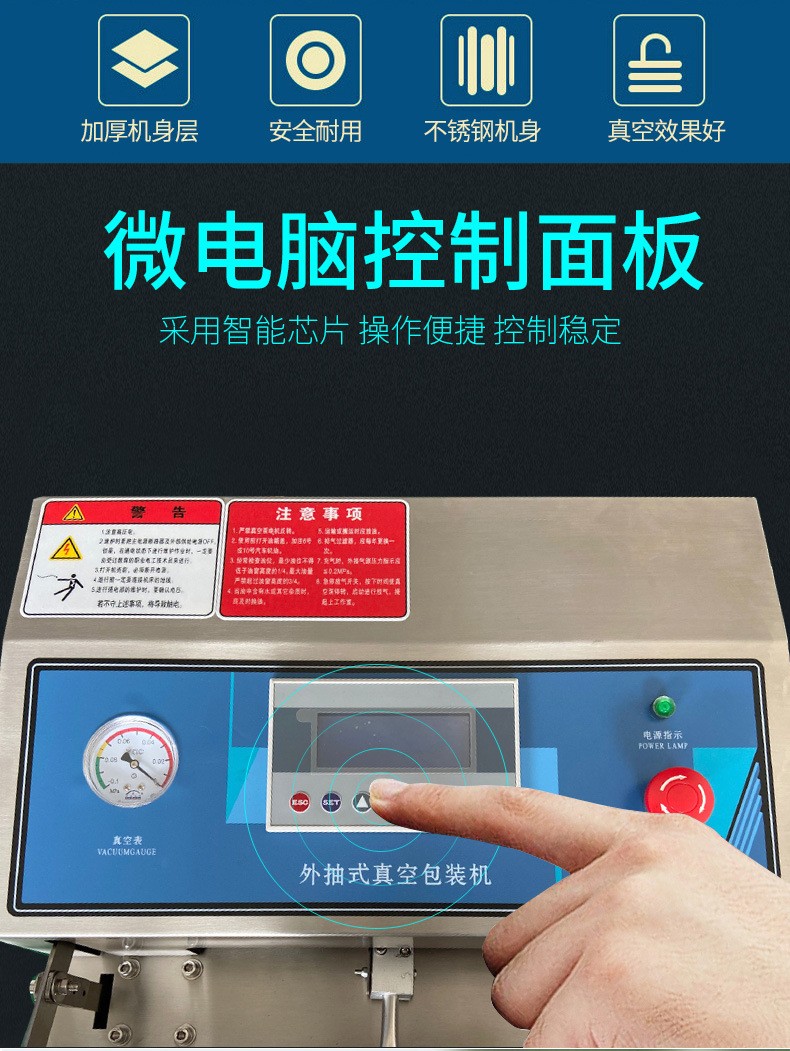 相較于單式內(nèi)抽真空包裝機,氣動外抽真空包裝機優(yōu)勢顯著。在工作方式上,外抽式無需將產(chǎn)品放入真空室,直接在外部對包裝袋抽氣,可避免產(chǎn)品受真空室尺寸限制,輕松包裝大型或形狀特殊產(chǎn)品。在包裝效率方面,外抽式抽氣速度快,像食品外賣行業(yè),能快速完成餐食包裝,適應快節(jié)奏生產(chǎn)需求,而內(nèi)抽式因真空室需密封、抽氣、恢復常壓等步驟,流程相對耗時