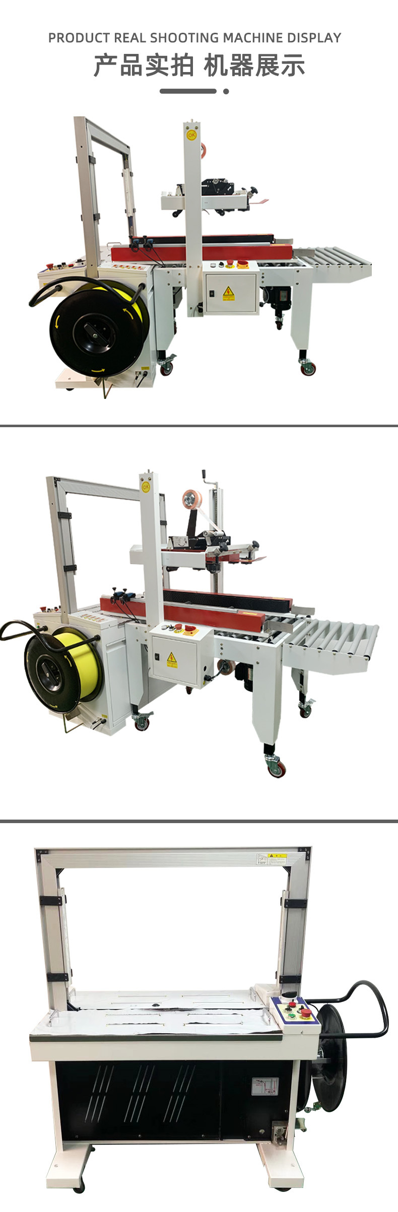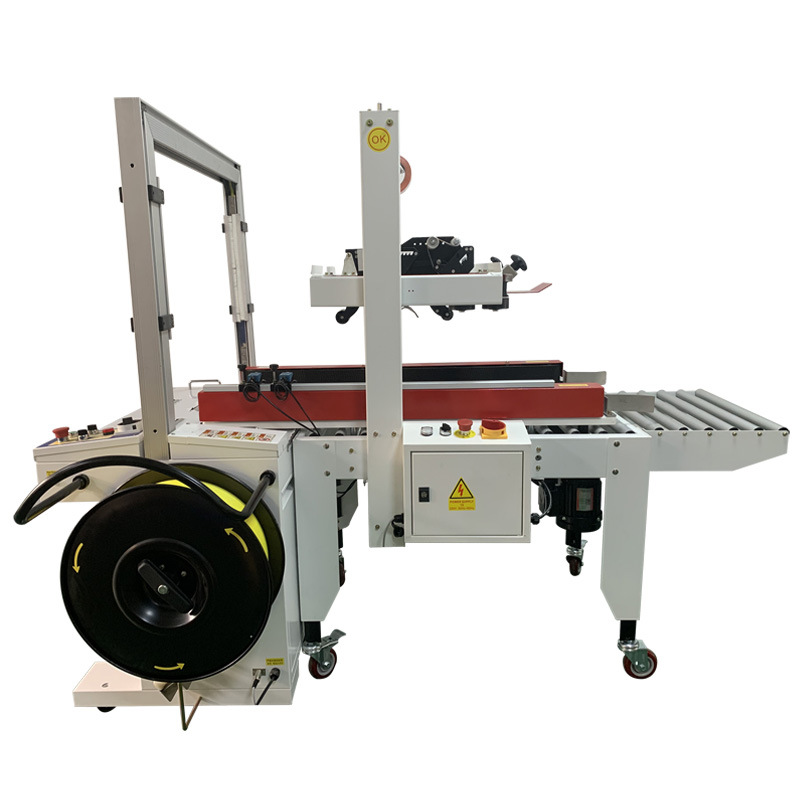這一自動化連續作業模式,極大程度減少了人工操作的時間與勞動強度。以往,人工封箱時,工人需手動將紙箱蓋子逐一折合,再小心翼翼地粘貼膠帶,每完成一個紙箱的封箱,都需耗費一定時間,且頻繁重復性動作易使工人疲憊。而在打包環節,人工穿帶、拉緊、固定打包帶,不僅操作繁瑣,速度也極為有限。如今,有了全自動封箱打包一體機,工人只需將空紙箱放置在起始輸送帶上,后續工序均由設備自動完成。據實際數據統計,相較于傳統純人工包裝,使用該一體機后,包裝效率可提升數倍甚至數十倍。例如,在某電商倉庫,以往人工包裝每小時僅能完成幾十件紙箱的封箱打包,而引入全自動封箱打包一體機后,每小時可輕松處理數百件,顯著提升了整體包裝效率,使企業在單位時間內能夠完成更多訂單的包裝與發貨任務,極大增強了企業的市場競爭力