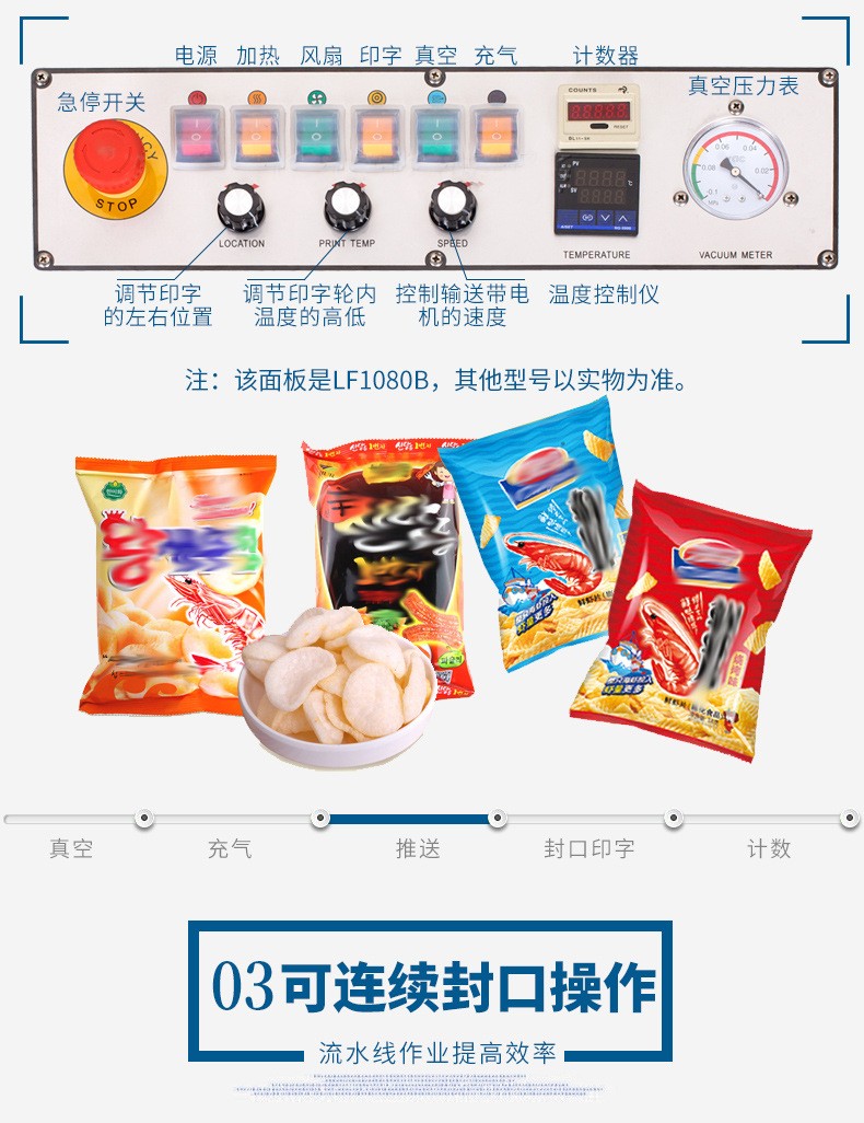 連續(xù)真空包裝機(jī)能夠?qū)崿F(xiàn)不間斷的連續(xù)包裝,大大提高了生產(chǎn)效率,節(jié)省時間與人力,適用于大批量產(chǎn)品的包裝