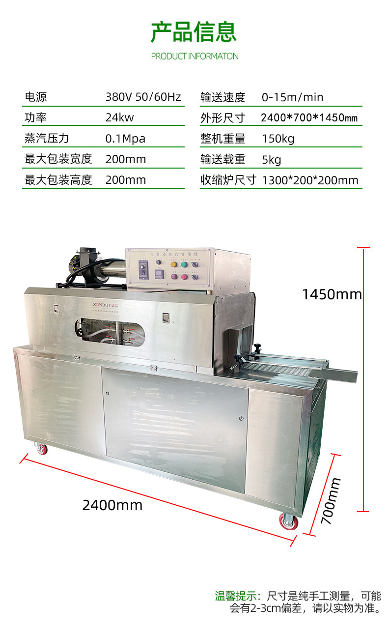- 收縮效果好:蒸汽能夠全方位地接觸熱收縮膜,使薄膜各個部位受熱均勻,收縮效果一致,能夠緊密貼合產品表面,無論是規則形狀還是不規則形狀的產品,都能達到理想的包裝效果,提升產品的外觀品質。