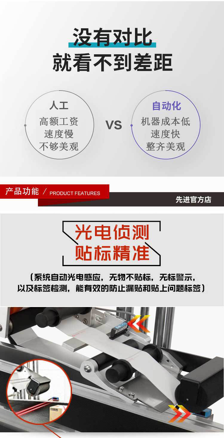 不干膠貼標機 由于該貼標機采用機電一體化的技術,選用大力矩步進電機驅動,及光電控制裝置、電源保護裝置等先進系統,因此具有啟動緩沖功能,整體靈敏度高,低速扭矩大,速度穩定,工作電壓穩定,抗干攏能力強等技術特性。 保證了貼標準確、穩定、可靠、高效。