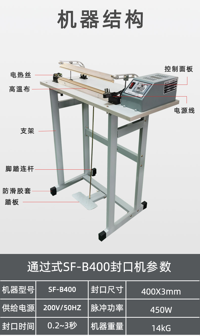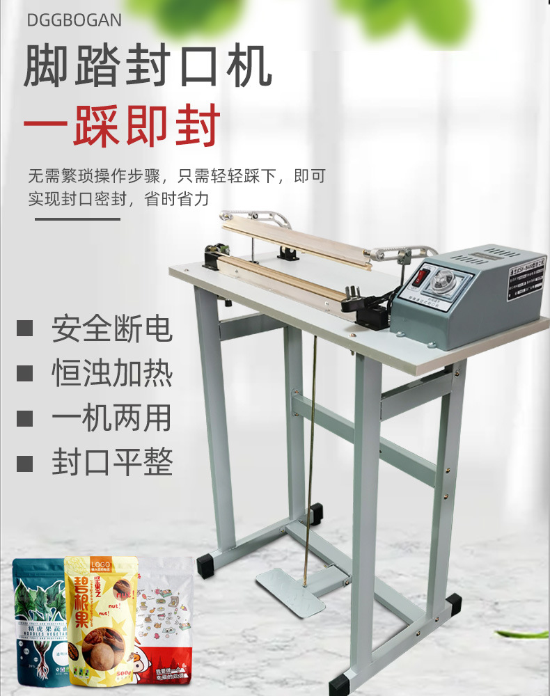 腳踏封口機是一種理想的封口設備,?適用于各種塑料袋薄膜的封口及制袋。?它特別適用于醫藥、?農藥、?食品、?日化、?潤滑油等行業的鋁箔袋、?塑料袋、?復合袋的封口。?這種設備利用電氣脈沖技術,?能夠顯著縮短封口時間,?從原來的2-4秒縮短至0.2秒,?具有投資少、?效益高、?封口長度長、?操作簡單等特點。?因此,?腳踏封口機被廣泛應用于食品、?醫藥、?土特產、?電器軟件、?工廠、?商店、?服務行業等領域,?成為這些行業中不可或缺的封口設備
