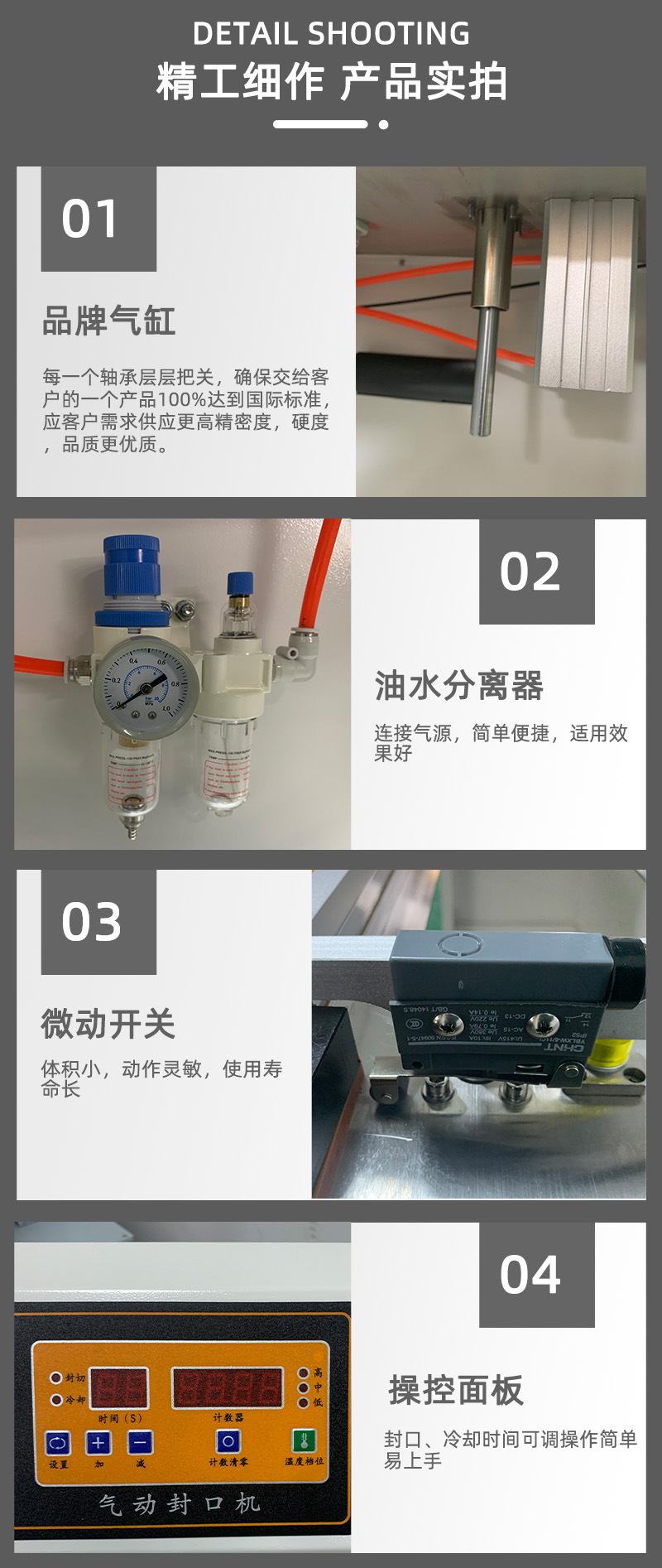 氣動封口機的特點包括雙氣缸工作為壓合動力,?封口、?冷卻封間采用時間繼電器控制,?可調性強,?能夠適應不同材料的封口需求,?且封口牢固、?平整美觀。?此外,?氣動封口機還具有電子恒溫控制和無級調速傳動系統,?能夠實現自動連續封口、?印刷產品標簽等功能,?進一步提高了其在商鋪和工廠的適用性