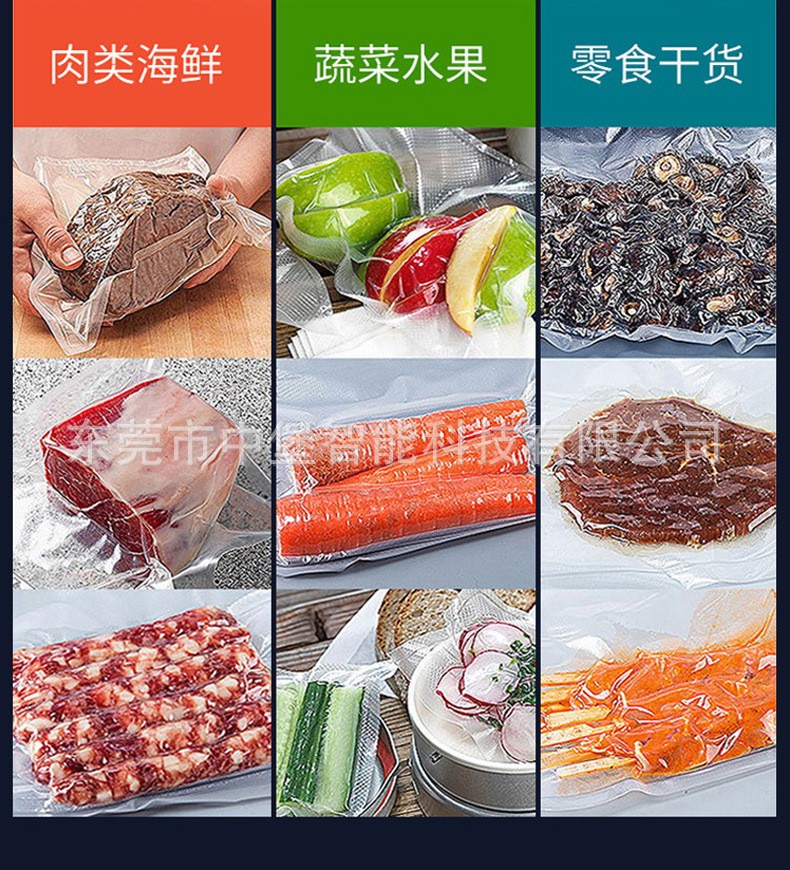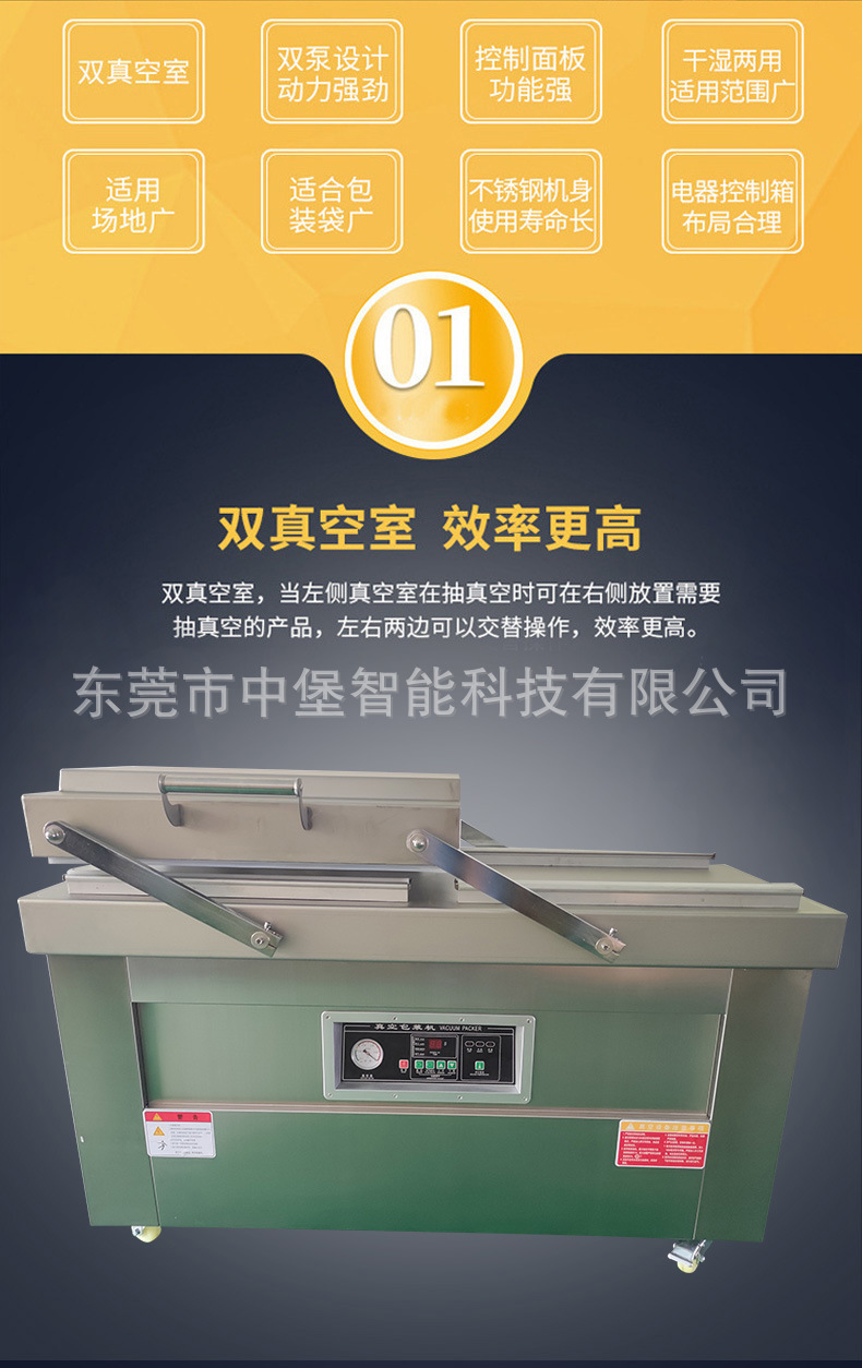 雙室真空包裝機的設計和制造考慮到了食品衛生與防腐的要求,上工作室裝有一組熱壓封口機裝置,并采用平衡結構,可改變任何位置停留,并有緩沖保護。此外,配置不銹鋼移動式移架,移動方便,不受地區限制,雙室真空包裝機廣泛適用:適用于食品行業、肉類、四川榨菜、醬制品、調味品、果脯、糧食、豆制品、化學品、藥材的顆粒、粉狀、液體等商品的真空包裝。