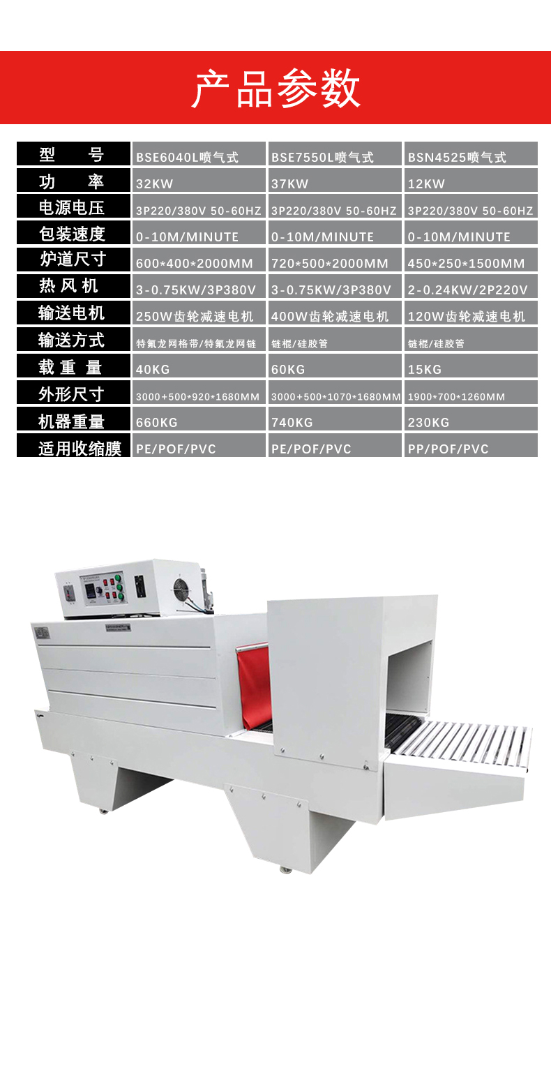 • 輸送速度:輸送速度決定了產(chǎn)品在加熱通道內(nèi)的停留時(shí)間,從而影響薄膜的收縮效果。輸送速度一般在 0.5 - 10 米 / 分鐘之間可變。對于大型、復(fù)雜形狀或需要充分收縮的產(chǎn)品,通常會(huì)采用較慢的輸送速度,以保證足夠的加熱時(shí)間;而對于小型、簡單形狀的產(chǎn)品,可以適當(dāng)提高輸送速度來提高包裝效率。
