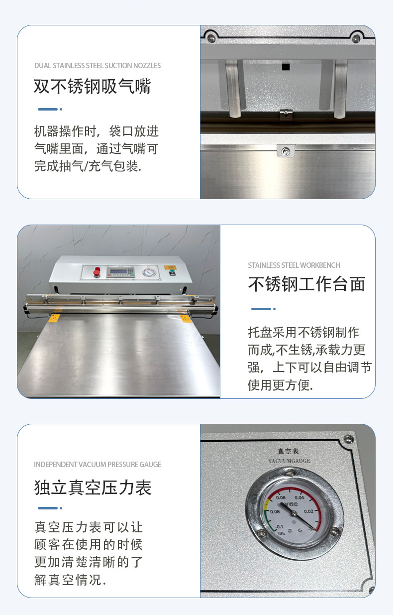 - 外部抽真空:機器的抽氣嘴貼近袋口,啟動后快速抽取袋內空氣,達到設定真空度。